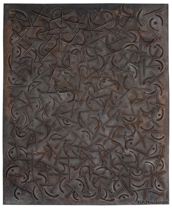 Kesähuivi, kupari, pakotustyö, alla värjätty messinkilevy